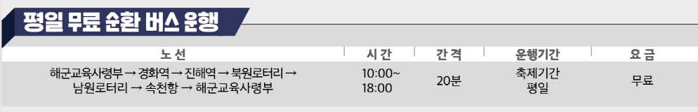 해군사관학교 및 군항 개방 행사장을 방문할 수 있는 군부대 순환 셔틀버스도 운행됩니다.