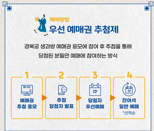 이번 경복궁 생과방 예매는 추첨 응모 후 당첨자만 예매할 수 있는 방식으로 변경되었습니다.