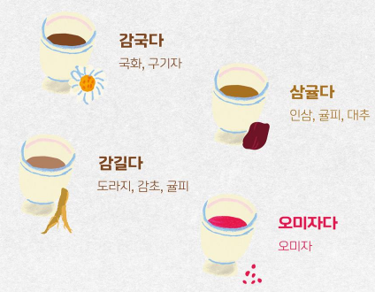 - 약차 종류: 감국다, 삼귤다, 감길다, 오미자다