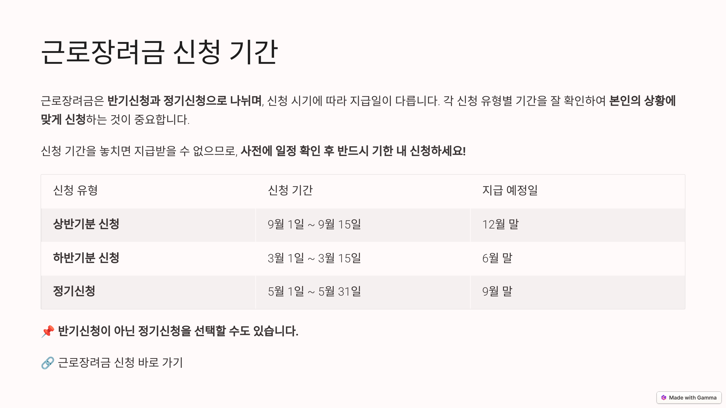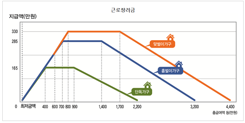 근로소득이 있지만 생활이 어려운 가구를 위해 최대 330만 원까지 지급되며, 매년 신청해야 지급받을 수 있습니다.