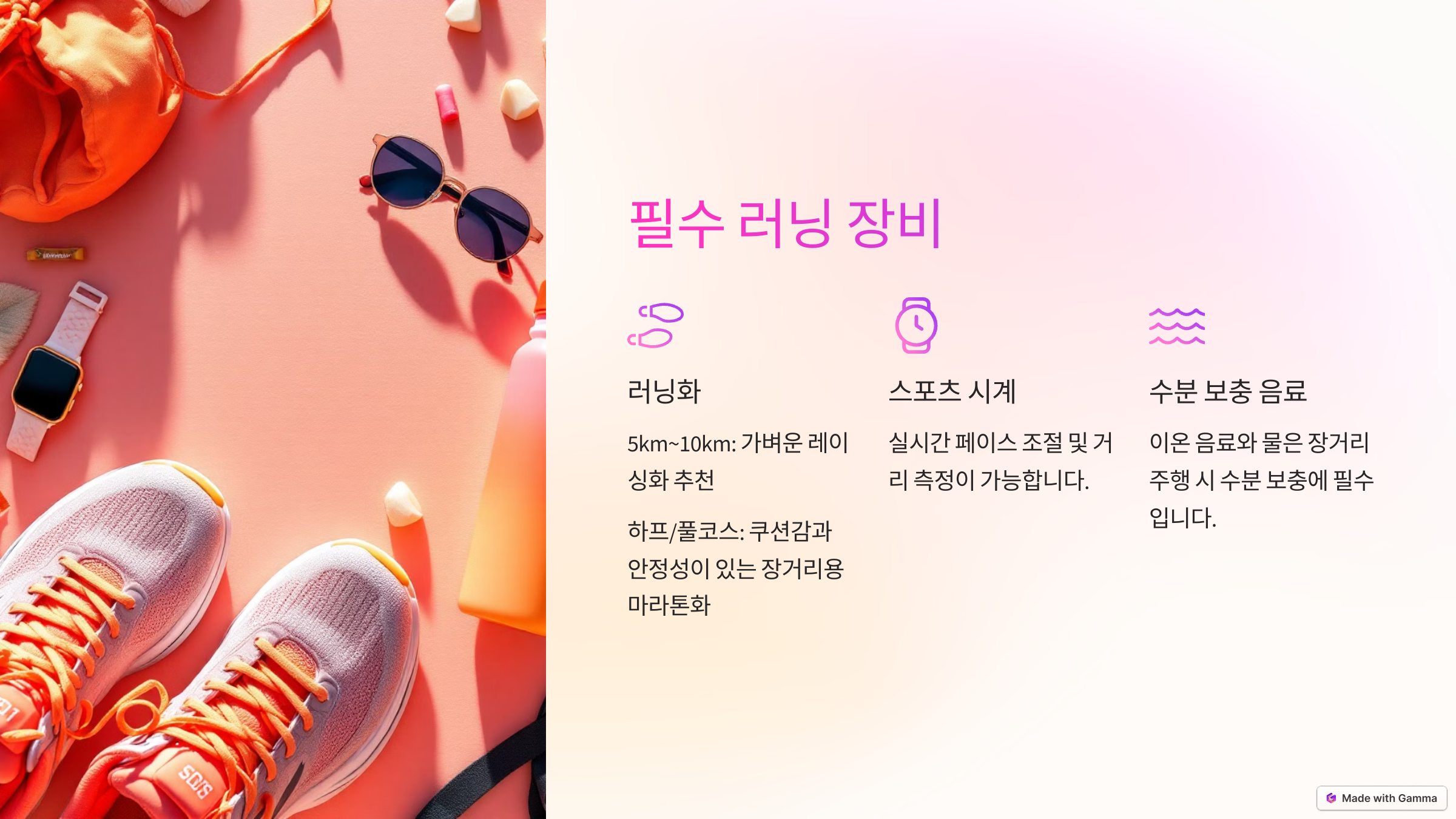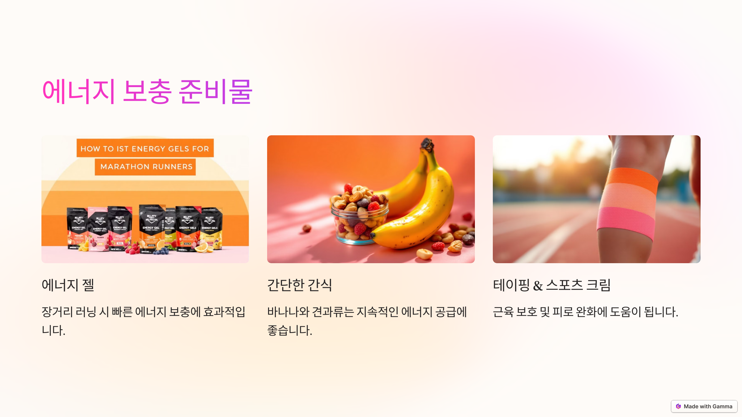 - 울트라마라톤: 장시간 레이스가 진행되므로 에너지 보충식 및 보조 장비 필수