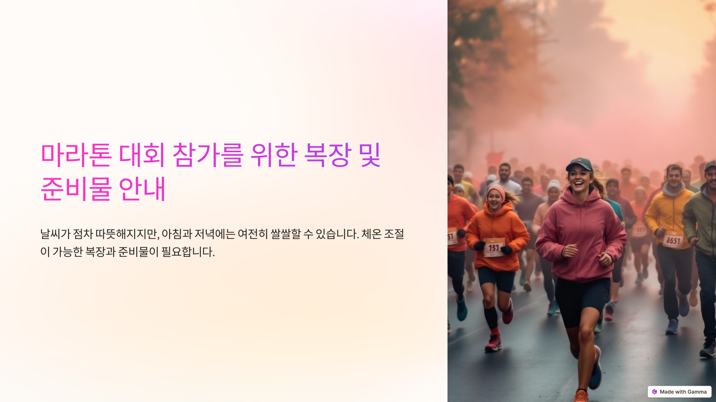 이번 가이드에서는 전국 각지에서 열리는 다양한 마라톤 대회 일정과 함께 참가 방법, 주의사항, 필수 준비물 등을 상세히 안내해 드립니다.