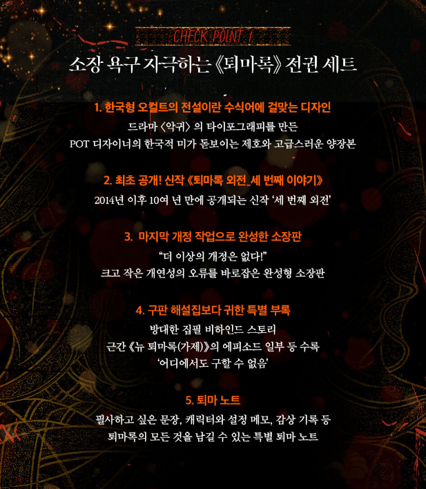 이번 소장판 세트는 기존 16권(본편 14권, 외전 2권)에 10년 만의 신작 『퇴마록 외전 – 세 번째 이야기』가 추가된 총 17권 구성으로 완결됩니다.